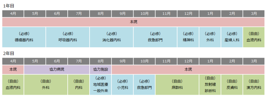 本院の各診療科と併せて、豊富な協力病院・施設の中から診療科単位で研修先を選択できます。最大10ヶ月間の自由選択期間を活用し、一人ひとりの多様なニーズに応えることが可能なプログラムです。